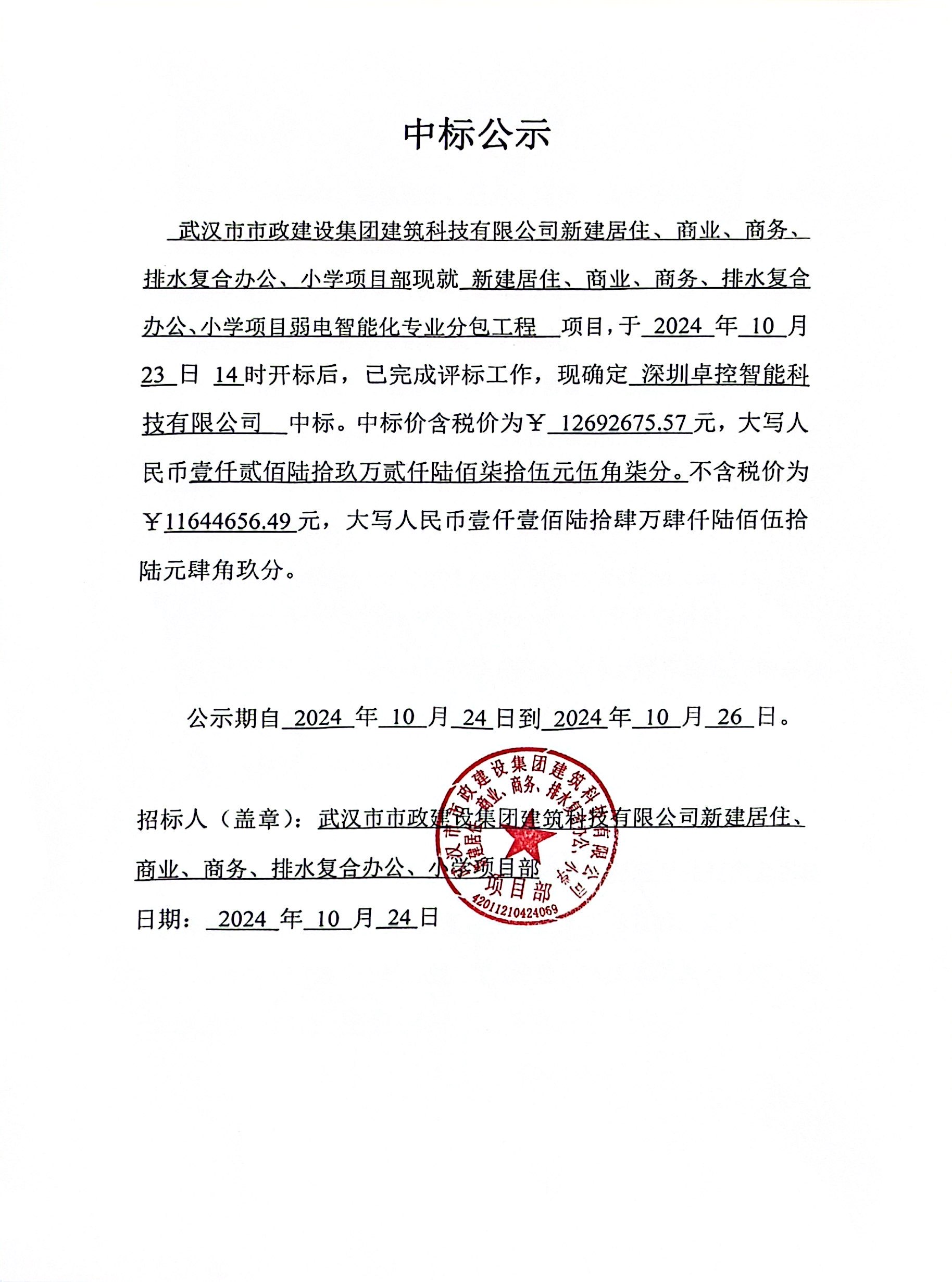 武漢市市政建設(shè)集團(tuán)建筑科技有限公司新建居住、商業(yè)、商務(wù)、排水復(fù)合辦公、小學(xué)項(xiàng)目弱電智能化專業(yè)分包工程中標(biāo)公示