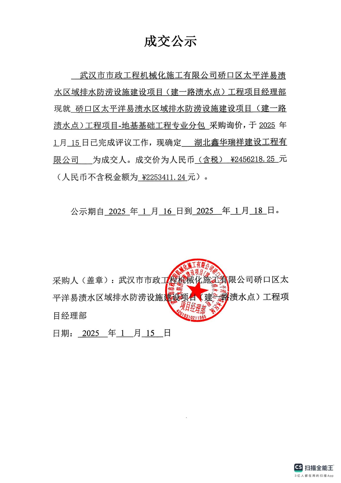 硚口區(qū)太平洋易漬水區(qū)域排水防澇設(shè)施建設(shè)項(xiàng)目(建一路漬水點(diǎn))工程項(xiàng)目-地基基礎(chǔ)工程專業(yè)分包成交公示