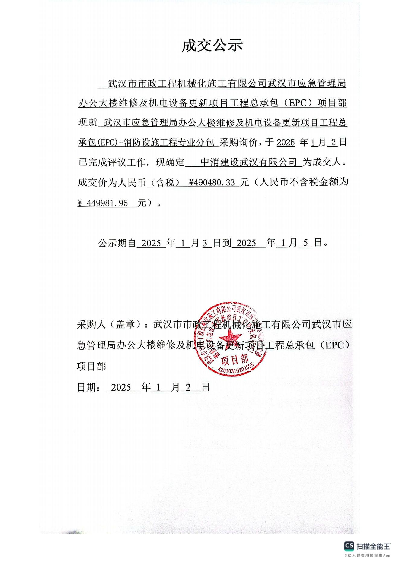 武漢市應(yīng)急管理局辦公大樓維修及機(jī)電設(shè)備更新項(xiàng)目工程總承包(EPC)-消防設(shè)施工程專業(yè)分包成交公示