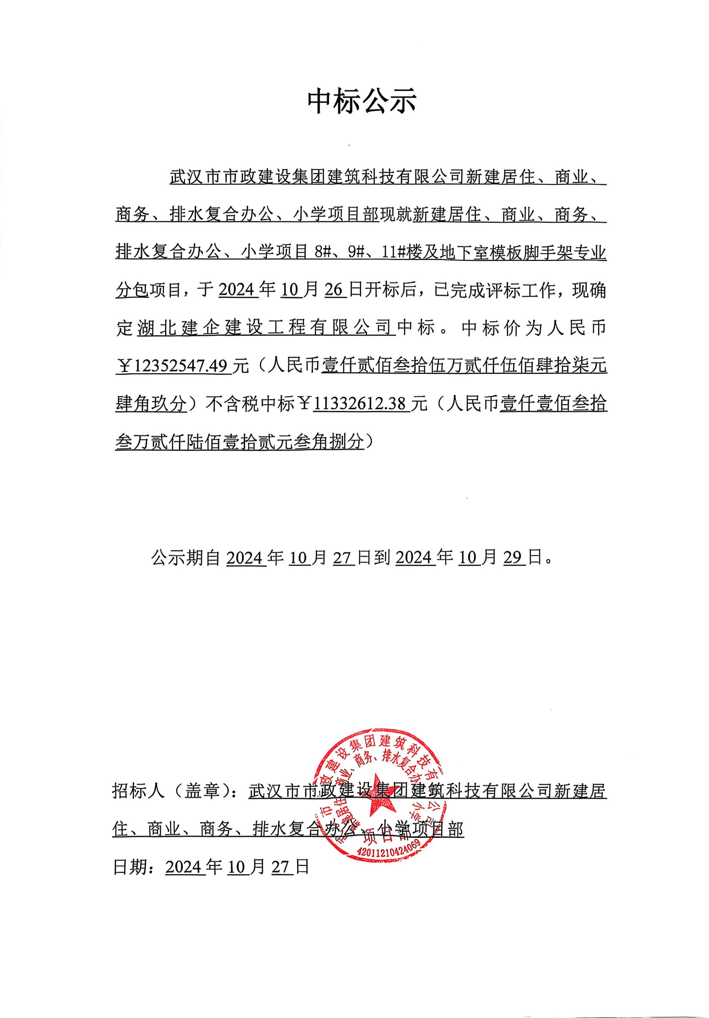 武漢市市政建設(shè)集團(tuán)建筑科技有限公司新建居住、商業(yè)、商務(wù)、排水復(fù)合辦公、小學(xué)項(xiàng)目8#、9#、11#樓及地下室模板腳手架專業(yè)分包招標(biāo)公示