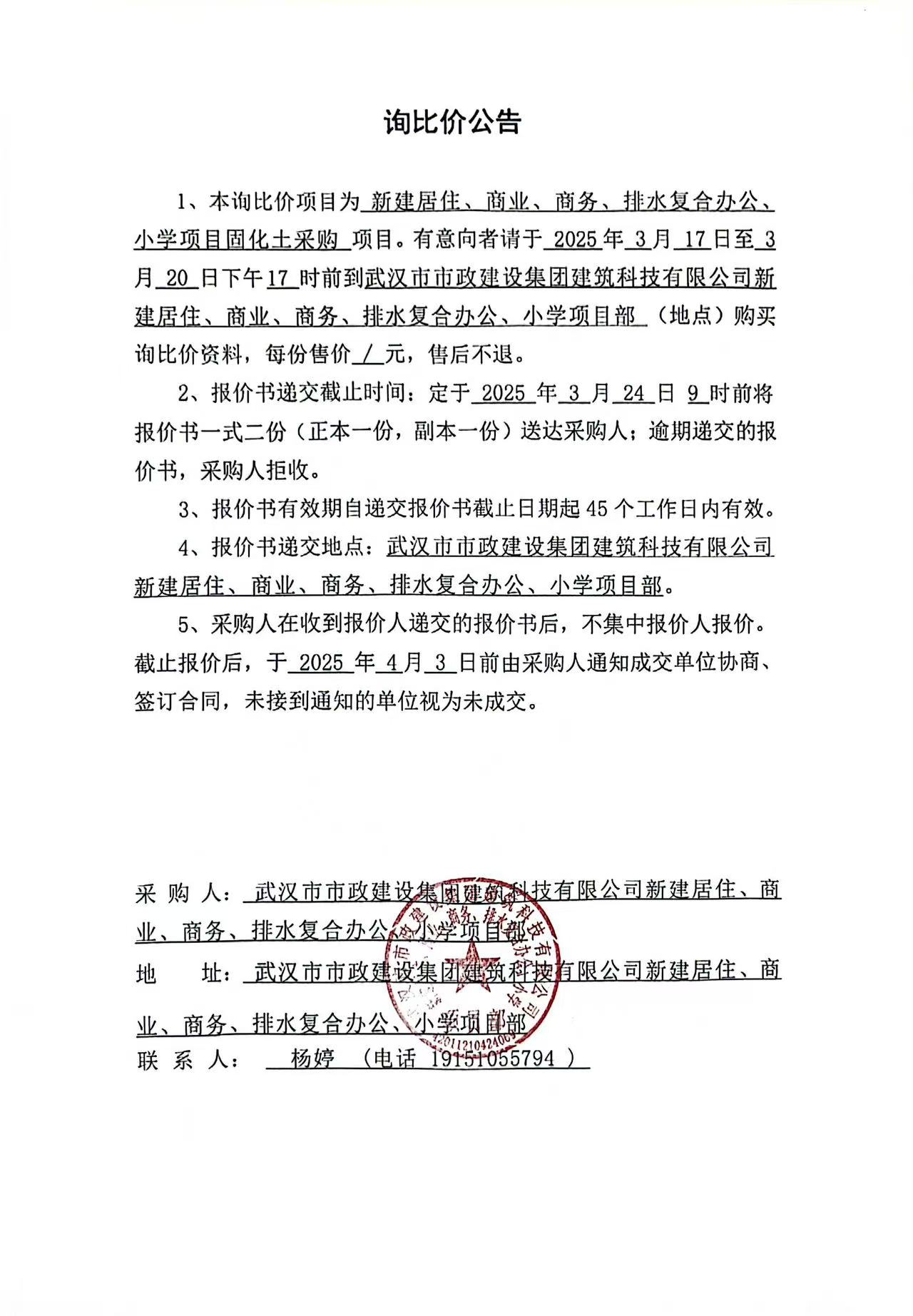 武漢市市政建設(shè)集團建筑科技有限公司新建居住、商業(yè)、商務(wù)、排水復(fù)合辦公、小學項目固化土采購詢價公告