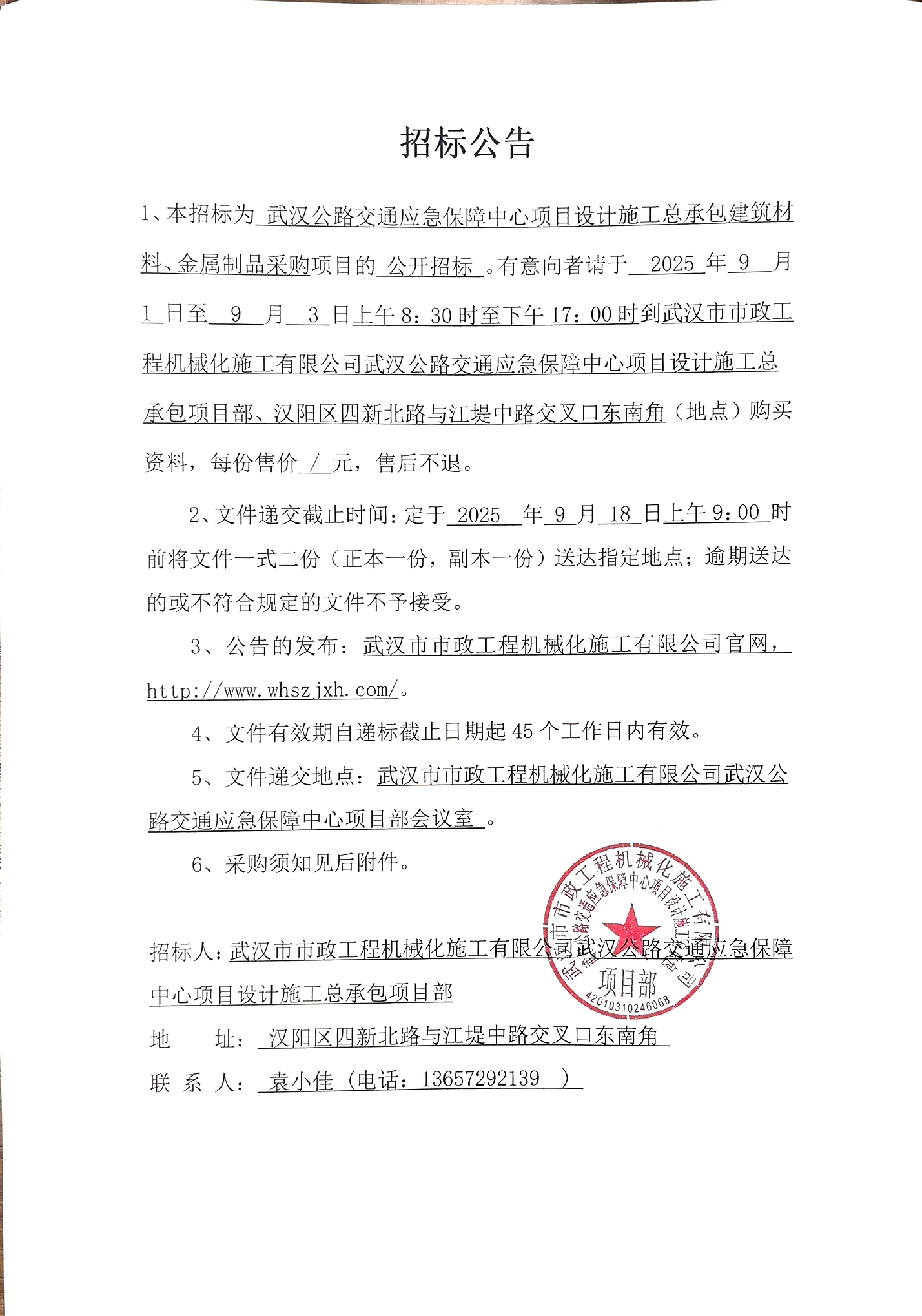 武漢公路交通應急保障中心項目設計施工總承包建筑材料、金屬制品采購招標公告