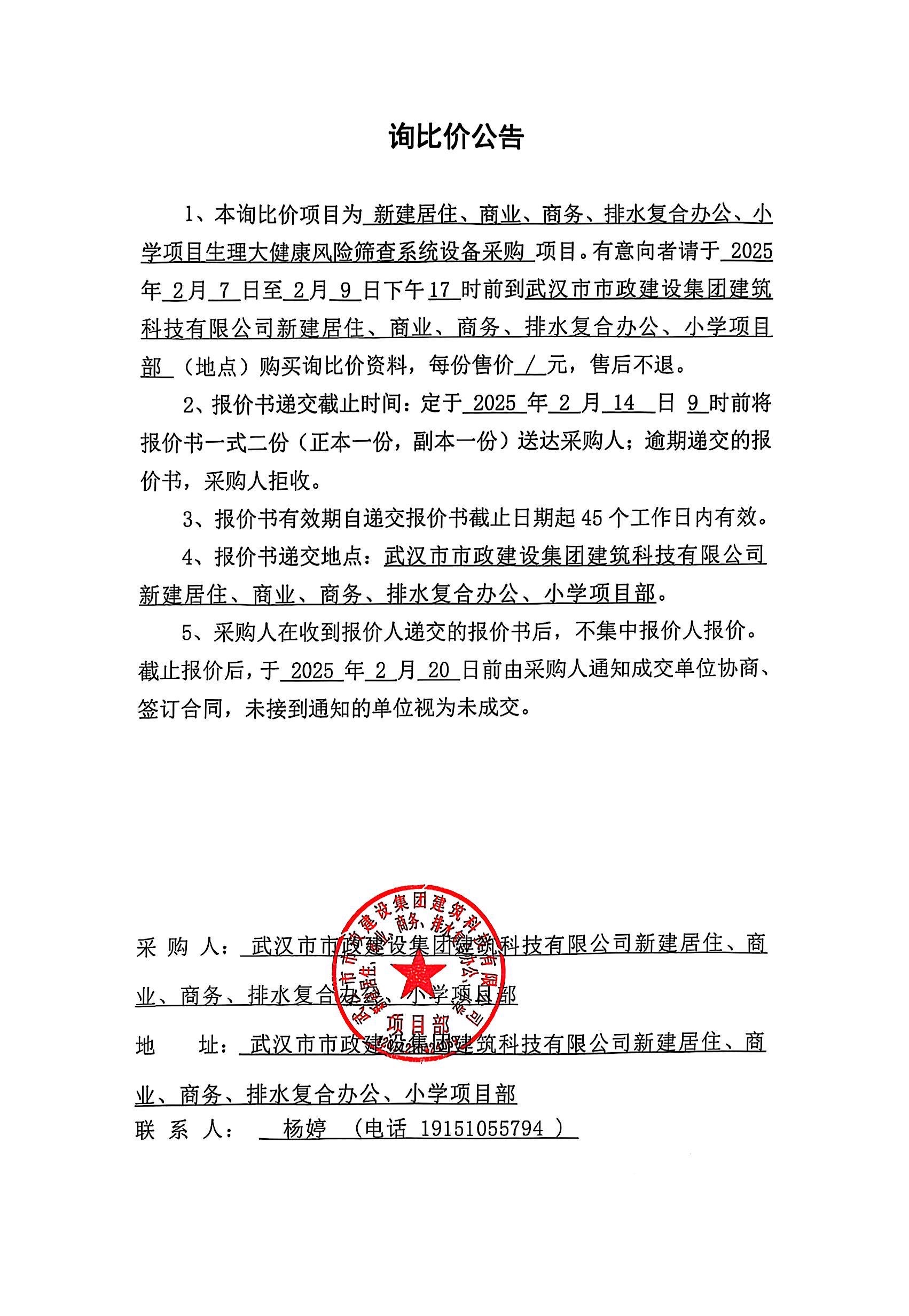 武漢市市政建設(shè)集團(tuán)建筑科技有限公司新建居住、商業(yè)、商務(wù)、排水復(fù)合辦公、小學(xué)項(xiàng)目生理大健康風(fēng)險(xiǎn)篩查系統(tǒng)設(shè)備采購詢價(jià)公告