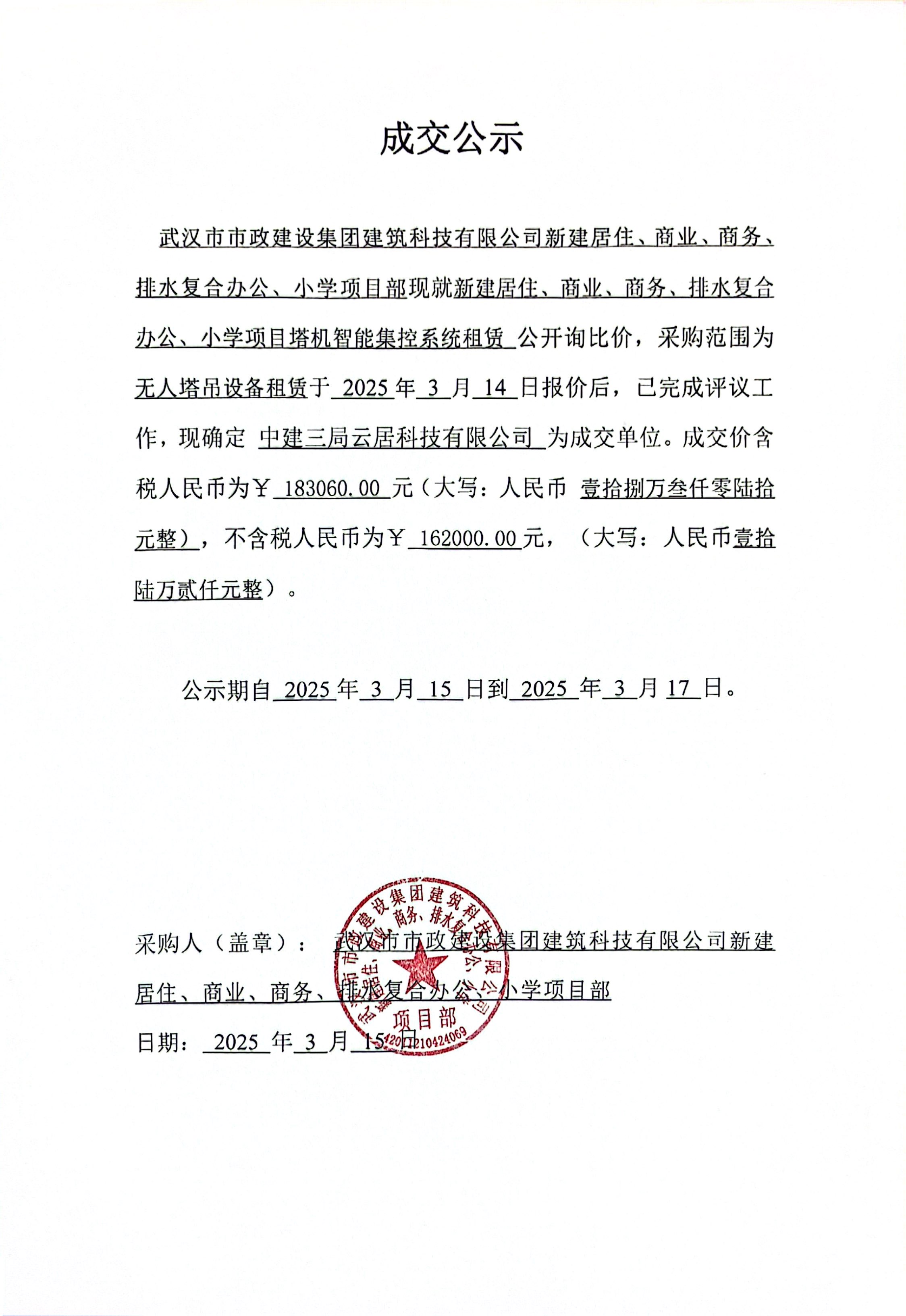 武漢市市政建設(shè)集團建筑科技有限公司新建居住、商業(yè)、商務(wù)、排水復(fù)合辦公、小學(xué)項目塔機智能集控系統(tǒng)租賃成交公示