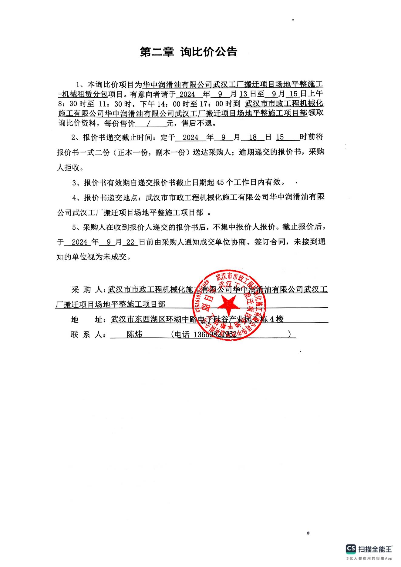 華中潤滑油有限公司武漢工廠搬遷項(xiàng)且場地平整施工機(jī)械租賃分包詢價公告