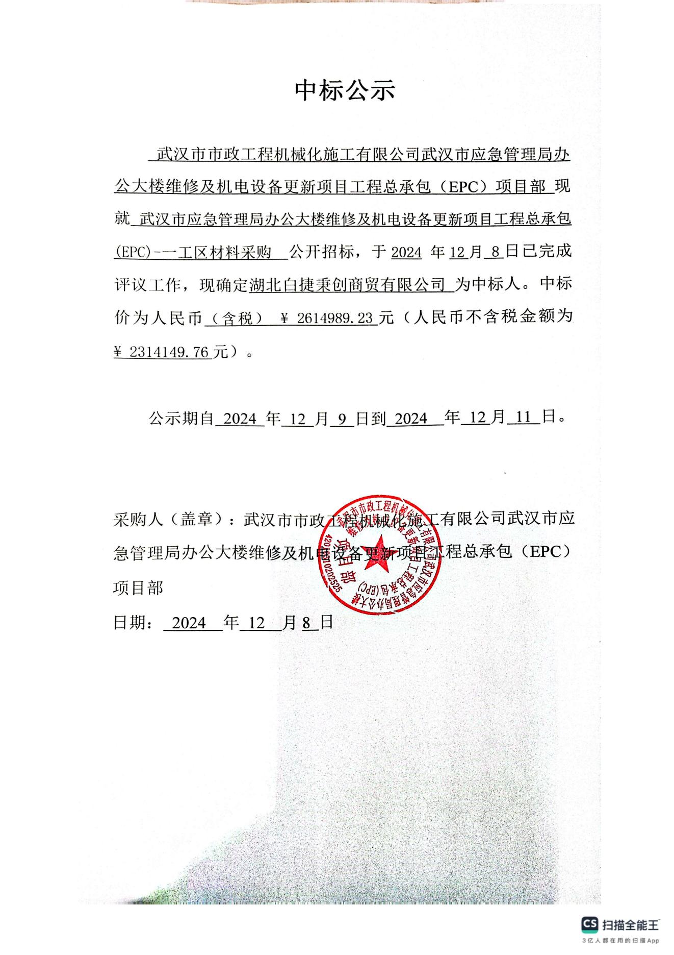 武漢市應(yīng)急管理局辦公大樓維修及機(jī)電設(shè)備更新項目工程總承包(EPC)-一工區(qū)材料采購中標(biāo)公示