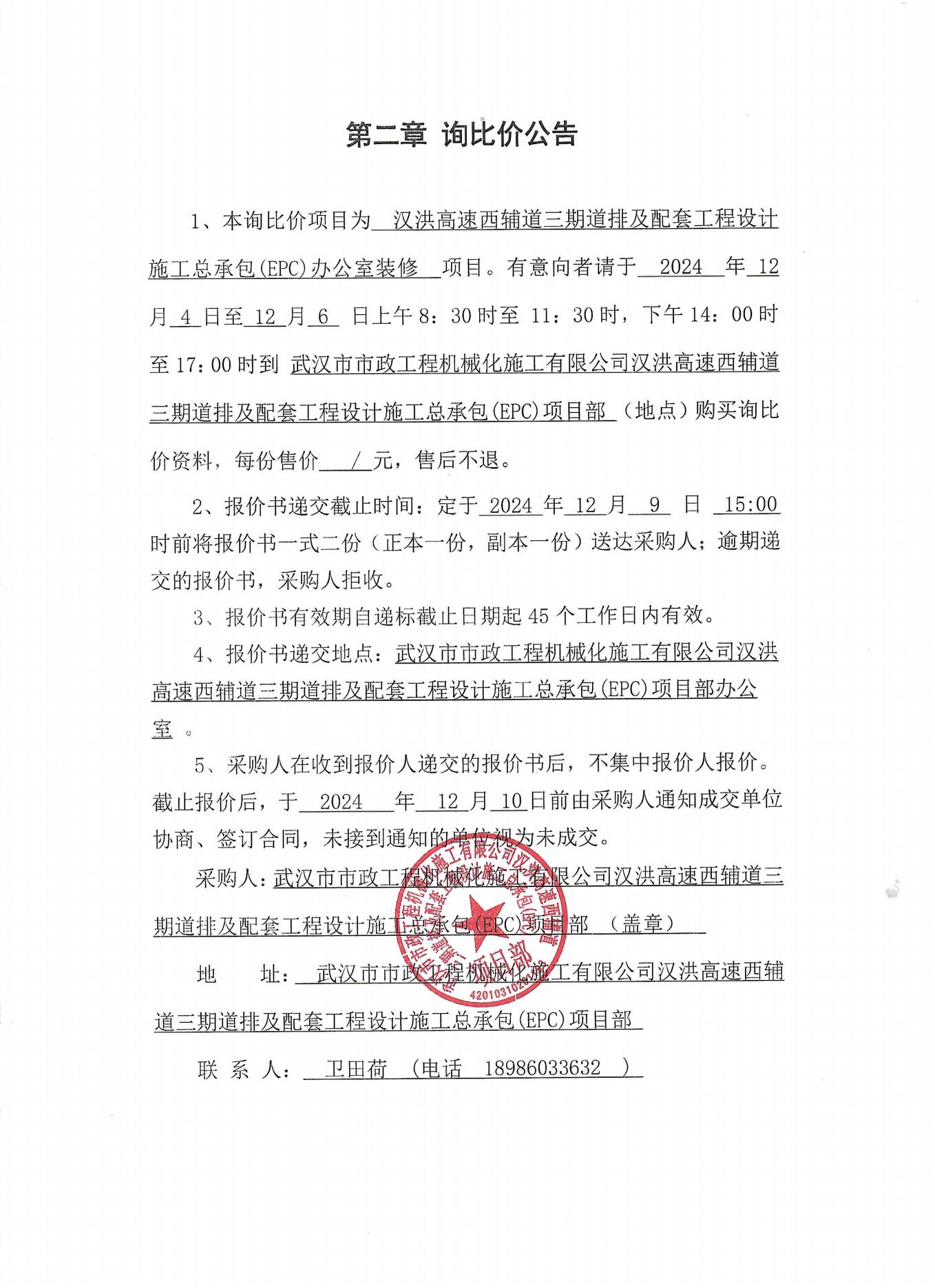 漢洪高速西輔道三期道排及配套工程設計施工總承包(EPC)辦公室裝修詢價公告